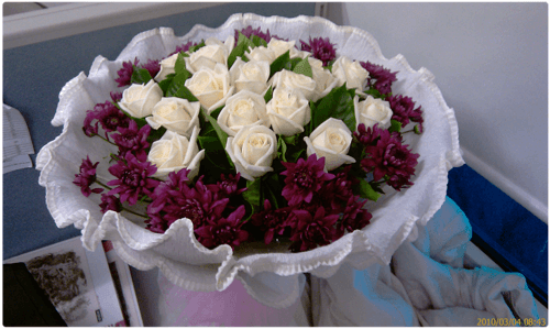 另外, 更值得一提的是生日當天除了收到朋友們的祝福外竟然還收到了一份很意外很震撼的禮物,一束鮮花: