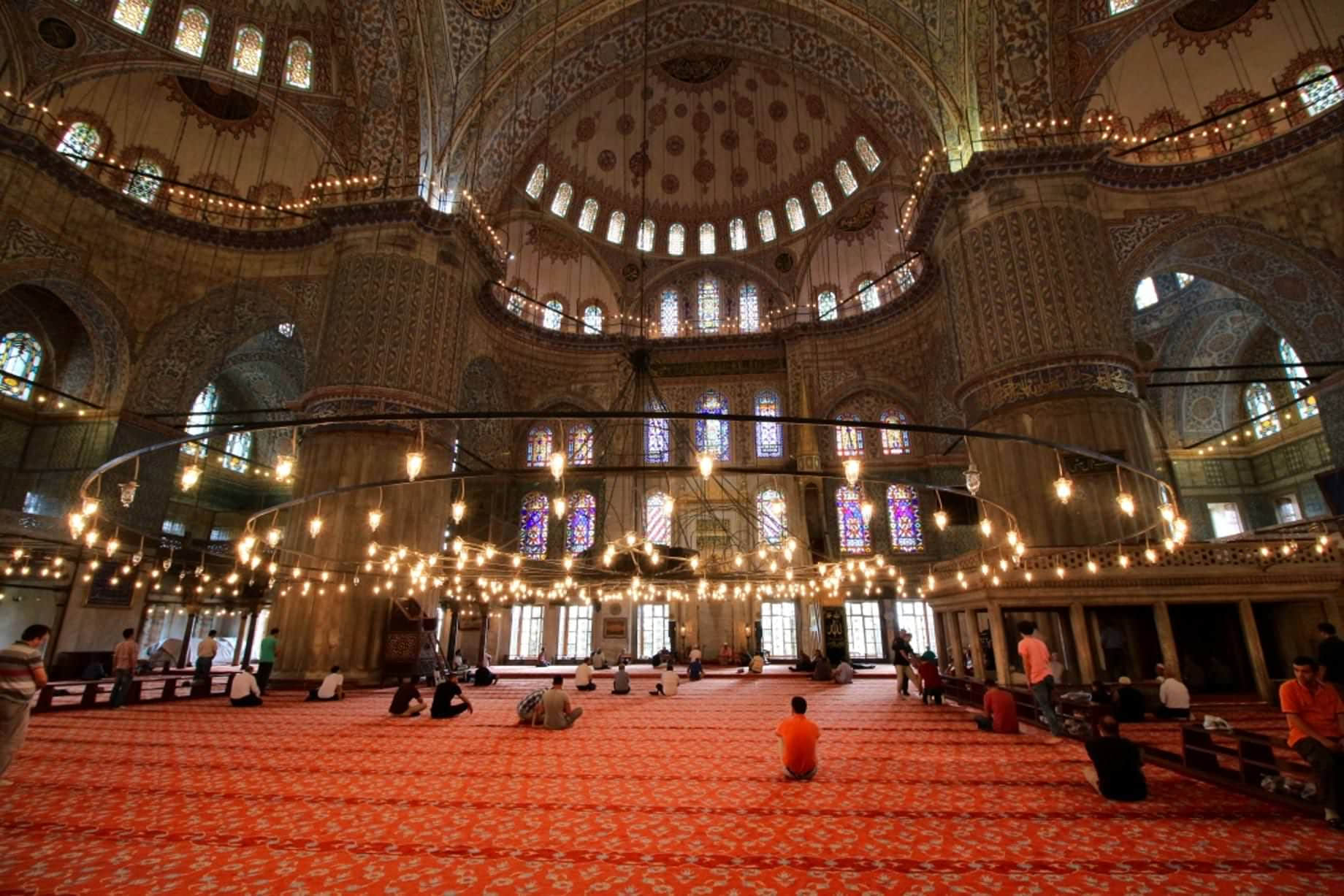 若想進入到藍色清真寺內部參觀,則需要按照他對遊客的開放時間從側門排隊入場,雖然排隊的人很多,但是其實也沒有等候太多時間,入口處有頭巾和圍裙出借,以便不符合衣著的遊客借用,所以無需太過擔心衣著問題。進入清真寺需要脫鞋,放入袋內自行帶入。至於傳說中的腳臭味,並沒有強烈的感覺,裡面會有一種特有的不知是甚麼香料的氣味。