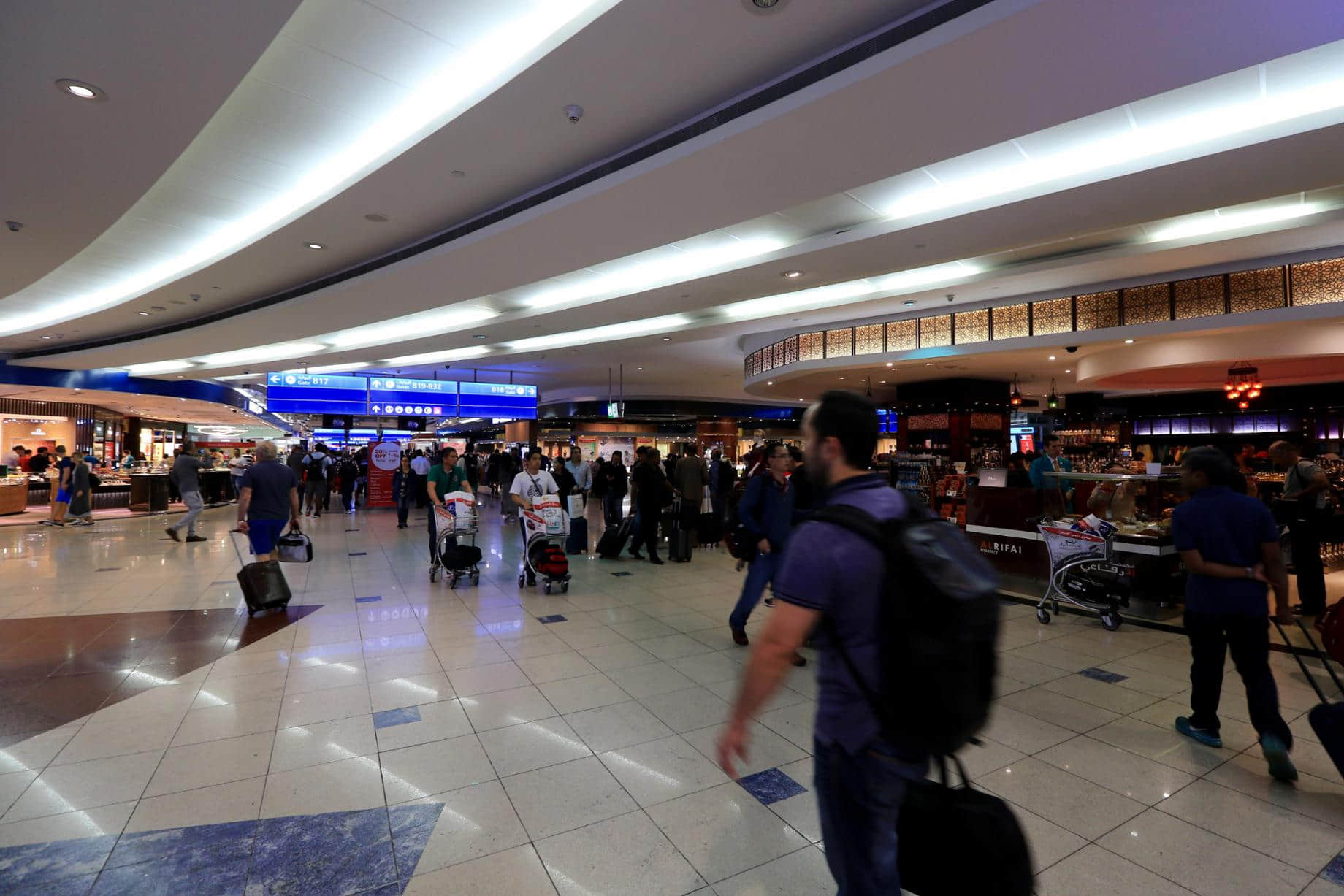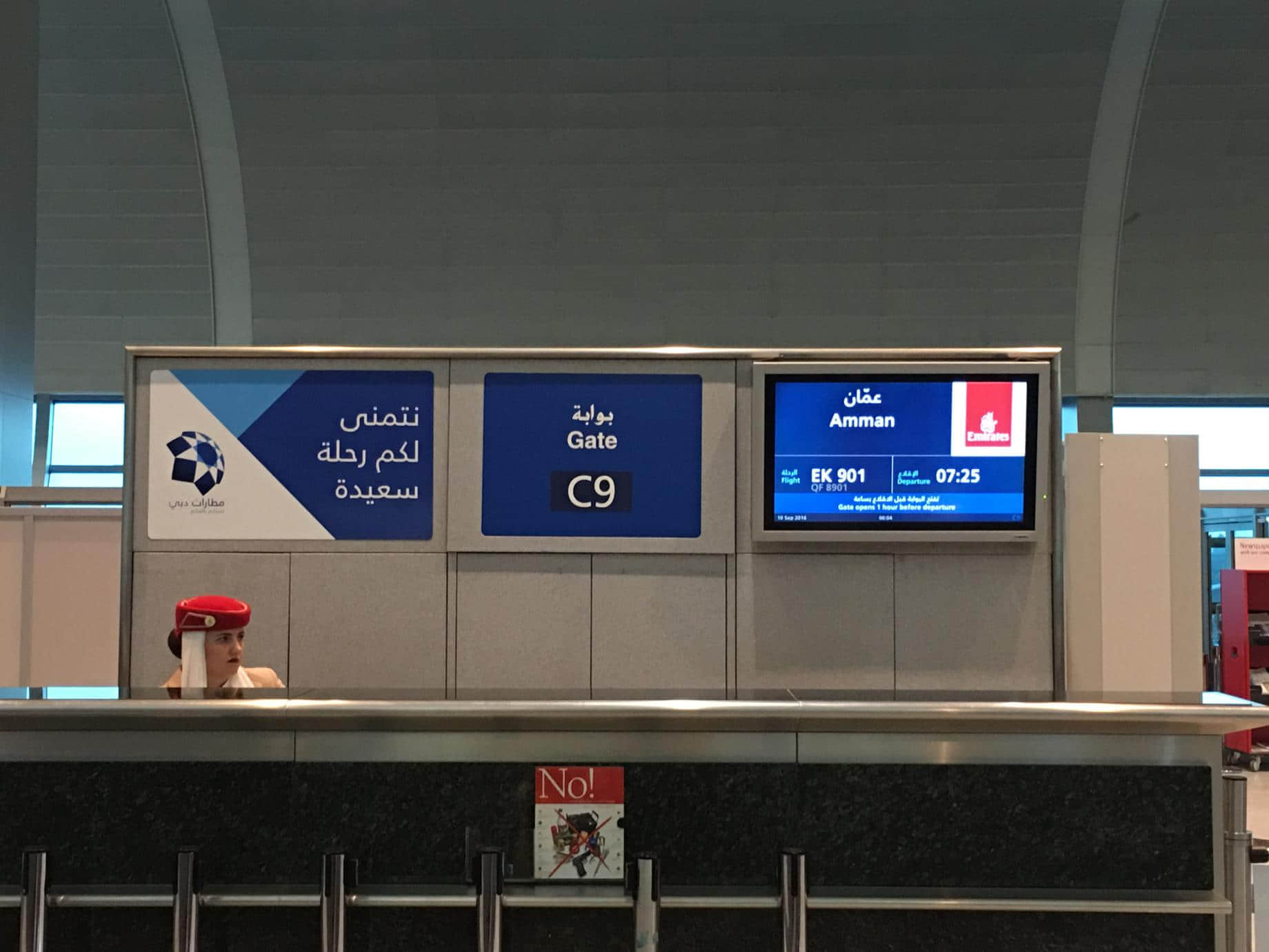 對於杜拜的第一印象,從飛機即將降落的那一刻開始產生。望出窗外,已然是接近零點的杜拜竟然是一片燈火通明,看的我目瞪口呆以致忘記了拍照。然後飛機降落杜拜機場,感覺就一個字,大。從飛機觸地,到行駛到落客位,足足用了有二十分鐘,然後乘坐巴士前往航站樓,又開了有十多分鐘。進到航站樓後,走到我轉機的登機口又走了我半個小時。