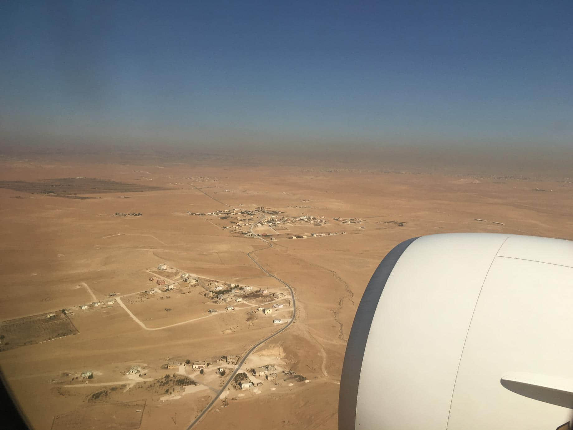 兩個多小時的航程,很快就到達了約旦這個神秘而又期待已久的國度。從舷窗望出去,看到的竟然都是沙漠,零星的在沙漠中會有一點建築物,顯得那麼孤立無援,心想不會真的降落在這裡吧?這哪裡像是一個可以落地的地方,荒涼的可以說鳥不拉屎。可真的在五分鐘後航機就真的降落在這片沙漠中了。