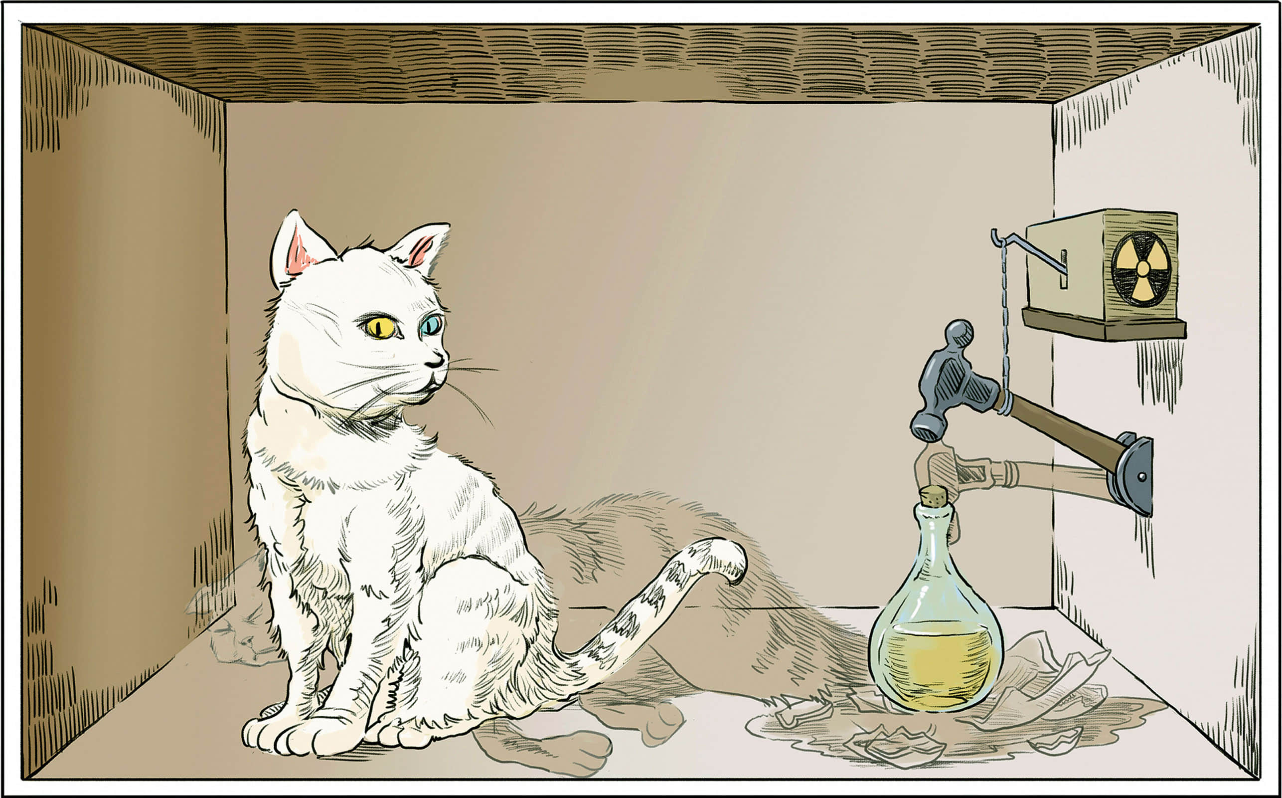 上面的這些理論,聽上去是不是覺得挑戰你的認知?是的,當時的物理學界,很多人(包括愛因斯坦大神)也都不是很 buy 這個聽上去腦洞大開,荒謬無比的理論。因此,根據「哥本哈根詮釋」的理論,物理學者埃爾溫·薛定諤提出了一個實驗構想,嘗試藉此反駁「哥本哈根詮釋」的荒謬性。那就是著名的「薛定諤的貓」(又稱薛丁格的貓) 實驗。