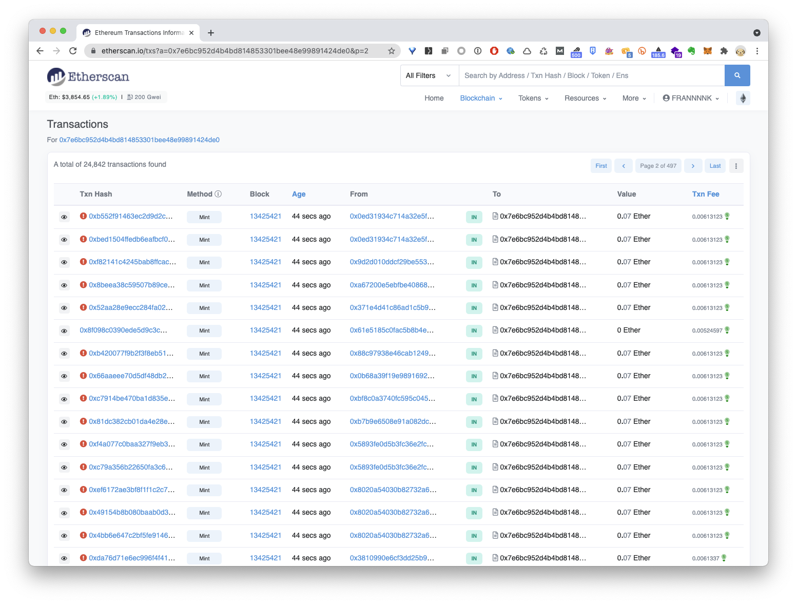 在 NFT 新發售的時刻,因為發售價往往會非常低,有點像新股發售的概念,所以大家擠破頭皮都想在NFT 新發售的時候搶到,正因為如此,出現上面的情況就不足為奇了。一些熱門的 NFT 項目,如果公開發售是使用這種「大家同時一起 mint」的模式,那麼如果你想得到 NFT,不給出超乎常理高的 gas price,則基本沒有希望能夠成功。