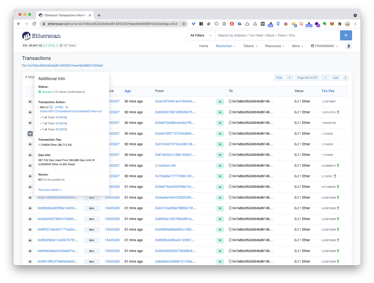 首先我們來欣賞一個 Etherscan 上的交易記錄。這個交易是 2021年10月16日 早上 Jungle Freaks 開賣時的其中一筆 mint 交易。各位請留意,這個交易, mint 了 3 個 NFT,每個 NFT 花費0.07 ETH, 但是,叮叮叮,有沒有注意到 Transaction Fee 竟然高達1.744 ETH,相等於 6,712 美元,52,195 港元。