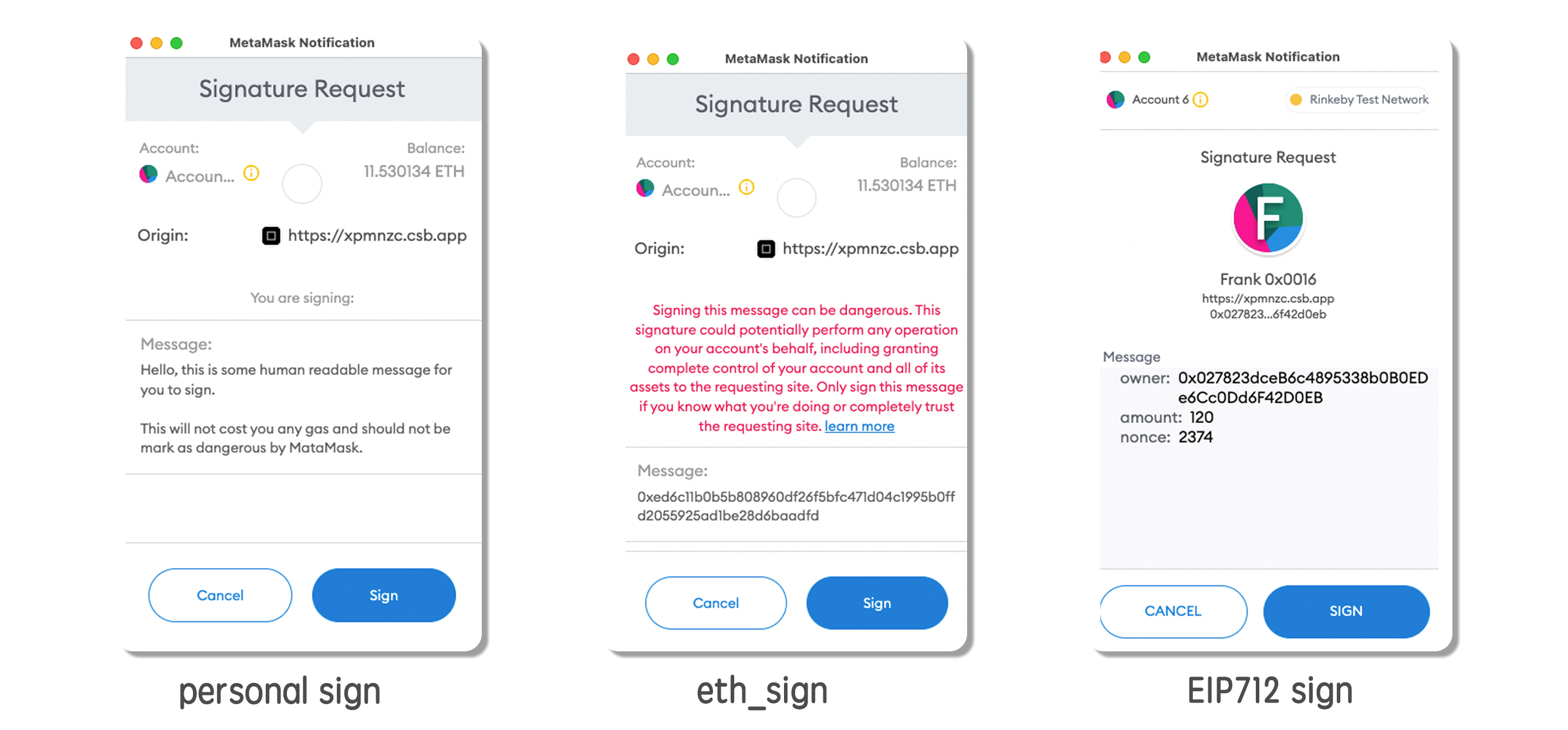 目前 MataMask 提供的簽名方法大致有三種,不同的方式有不同的應用場景。