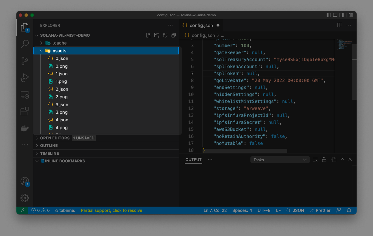 mkdir assets這個資料夾中需要存放 NFT 的相關檔案, 格式是 0.json 和 0.png ,json 檔案是 NFT 的 metadata , png 則是 NFT 的圖案。有多少個 NFT,就要準備多少對 json 和 png。